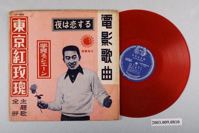 「龍鳳唱片公司」出品編號「LLP-3004」,12吋塑膠唱片,標題為「電影歌曲:『東京紅玫瑰』全部主題曲」,1968年6月出版,由日本歌王橋幸夫及由美香演唱。封套正面為日本勝利唱片公司1967年發行的編號SV-537橋幸夫單曲唱片專輯封套圖,改以灰階影印輸出而成。
