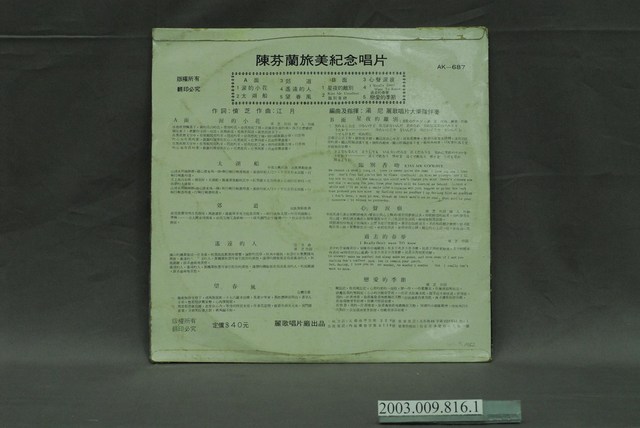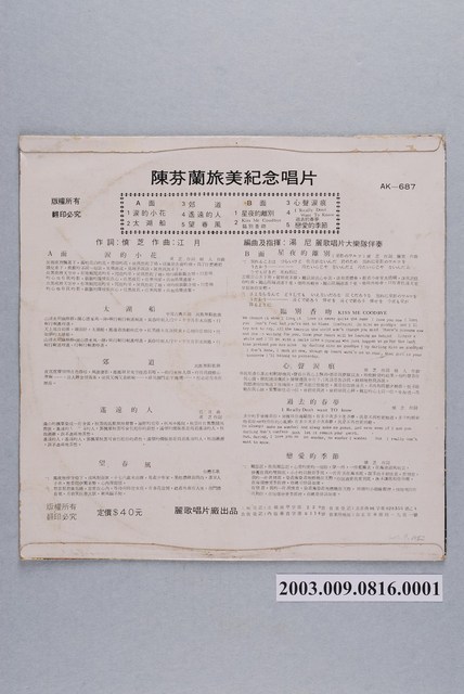 麗歌唱片公司出品編號「AK-687」流行歌曲專輯《陳芬蘭旅美紀念唱片》
