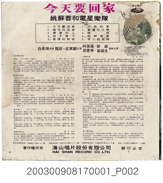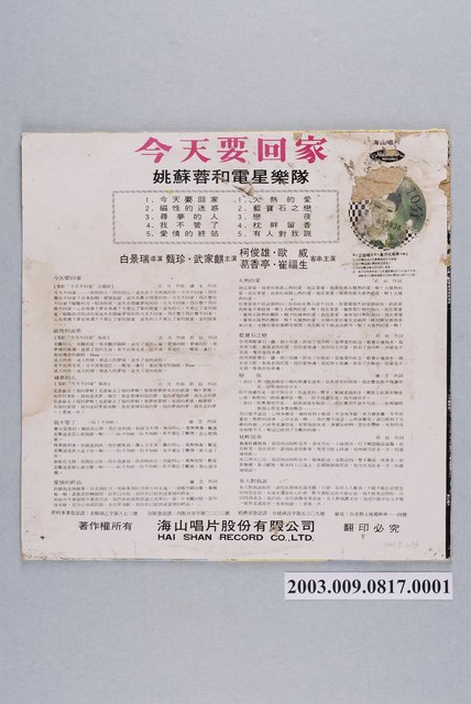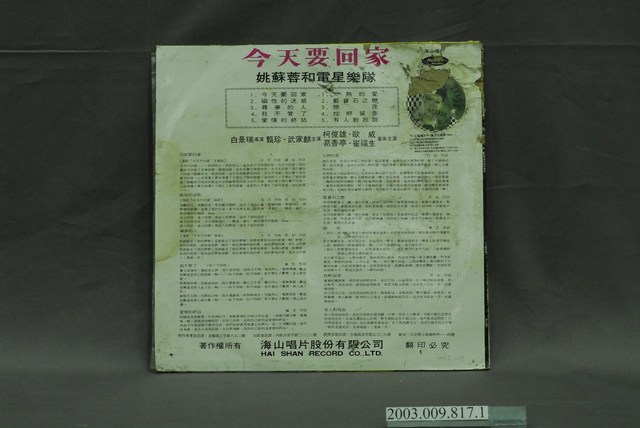 2003.009.0817.0001 海山唱片公司出品編號「SL-2078」國語流行歌曲專輯《今天要回家》唱片封套