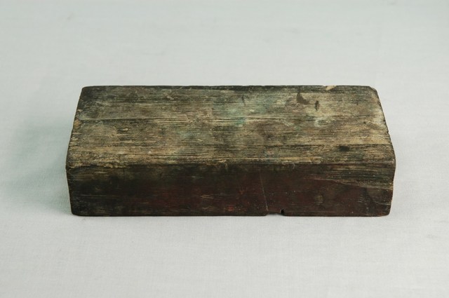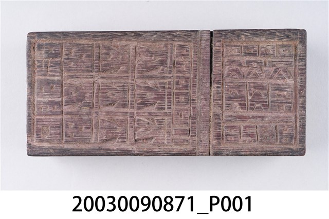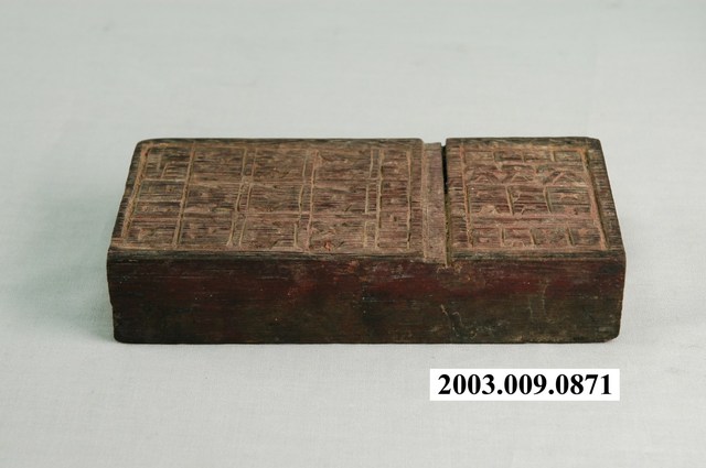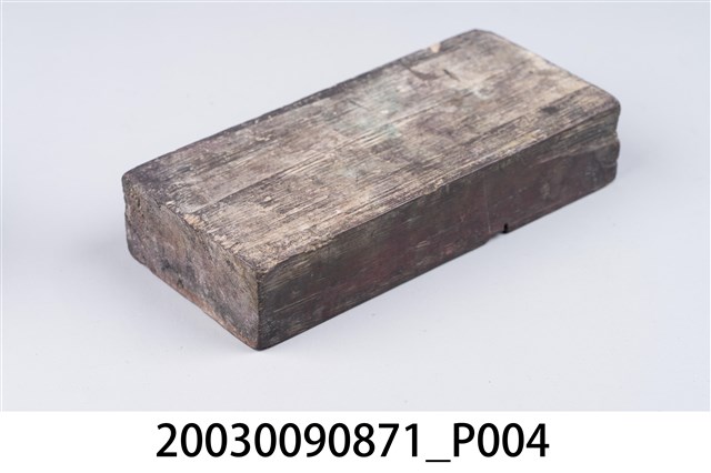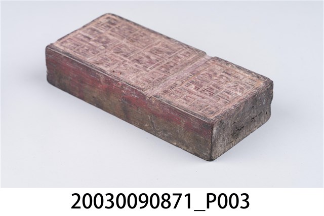 金銀紙在包裝之前,都會蓋各種神祇象徵的或名稱的版印圖案。本件木刻印版為橫式淺刻,內容不詳,分為左、右兩部份。外觀老舊,整體保存完整。