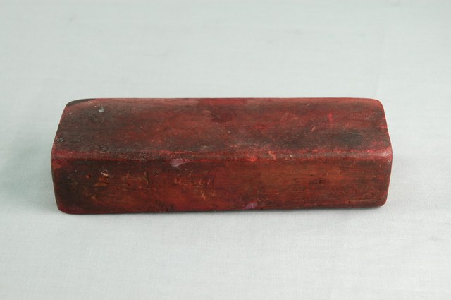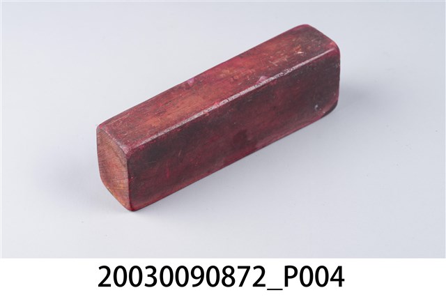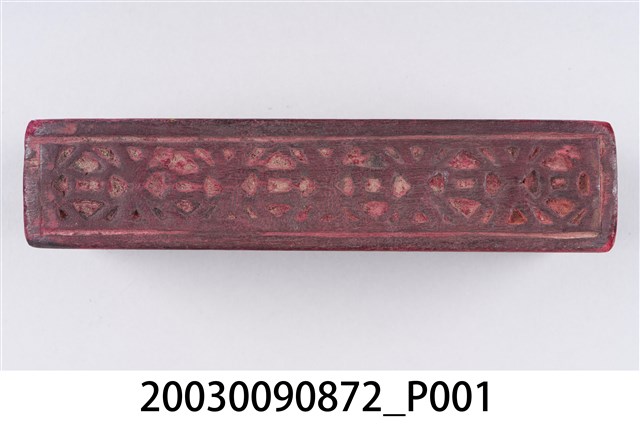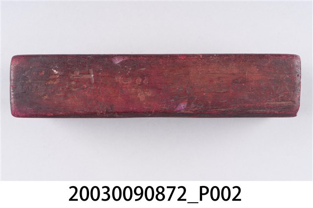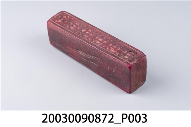 金銀紙在包裝之前,版面都會蓋上各種神祇象徵的或名稱的版印圖案。本件木刻金錢圖案印版內容為6個金錢圖案排列,周邊有線框,表面紅色,側面有數道刮痕,印版各錂角有磨圓現象,整體保存完整。