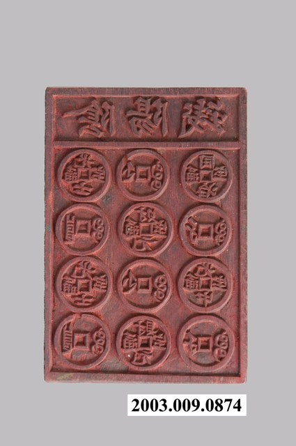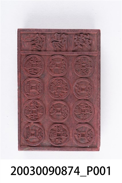 金銀紙在包裝之前,版面都會蓋上各種神祇象徵的或名稱的版印圖案。本件木刻陰陽錢印版為直式圖案,內容有6個陽錢、6個陰錢,合計12個錢幣圖型,陽錢幣上有文字,陰錢幣上則是圖型,印版上方有「陰陽錢」3字。印版正面呈紅色,背面呈暗褐原木色,整體保存完整。
