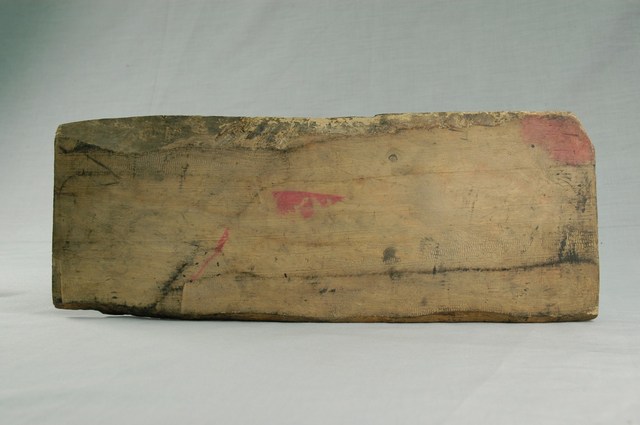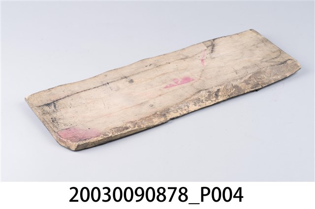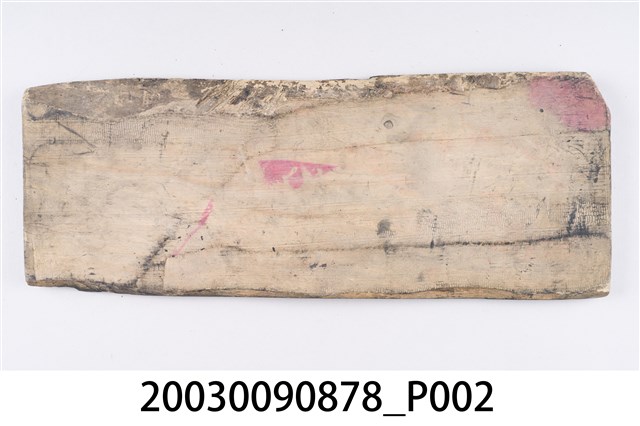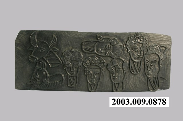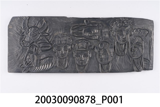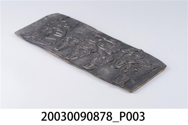 金銀紙在包裝之前,版面都會蓋上各種神祇象徵的或名稱的版印圖案。本件木刻人獸頭形印版為橫式陽刻,左邊為1牛頭、馬頭,中間及右邊分布著4女2男的頭形,2男分別是僧人、童子。印版正面呈黑色,保存完整,背面為原木色,一側有蛀蝕情形。