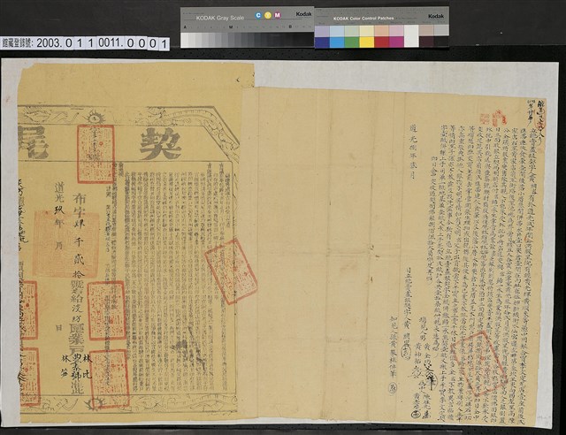 2003.011.0011 道光8年黃綢立絕賣盡根瓦店契與契尾