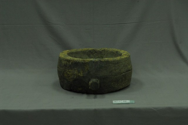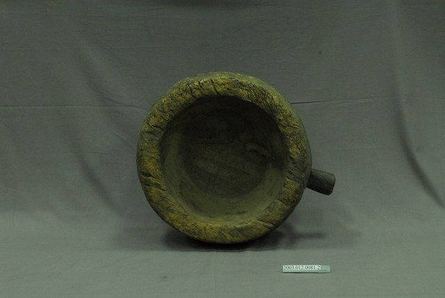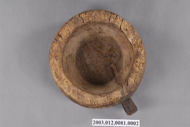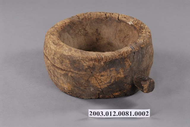 2. 本件為圓形之淺身木臼,擷取一段樹幹向內挖鑿而成,底平,側邊帶一方形凸耳。使用時搭配石杵以搗製穀類食物,將穀類去其殼,或者是將煮熟的糯米打製成麻糬 (avai) 。