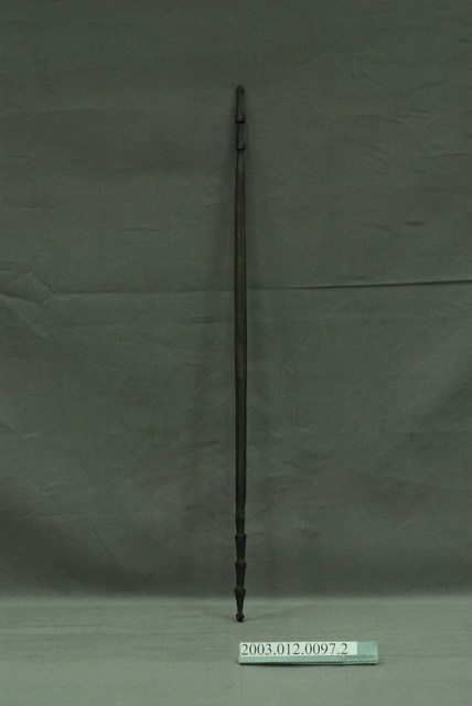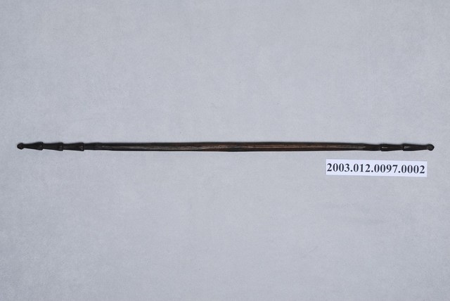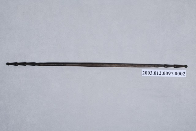 1. 本件為織布機組件之一綜絖棒,達悟語稱koyoen,外形為十分細長之木棒,兩端削成尖狀並雕刻成3節式樣。織布時依照所需要織出的紋樣,使用1-5支綜絖棒,其功能在穿綜絖便於分闢梭口,將綜絖棒的一支穿進綜套內,另一支位於套外,再以線將開口的一端紮牢,不使經線脫落或弄亂,以織出各種變化之圖紋