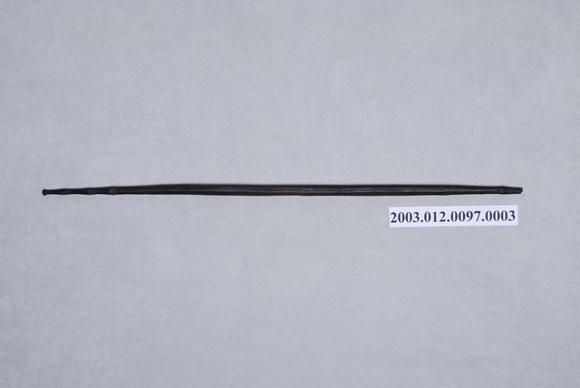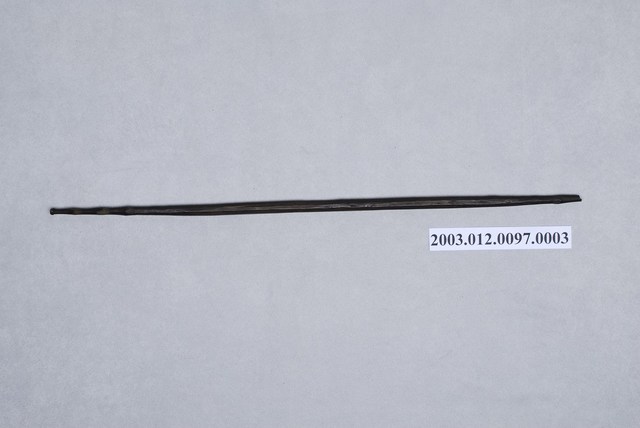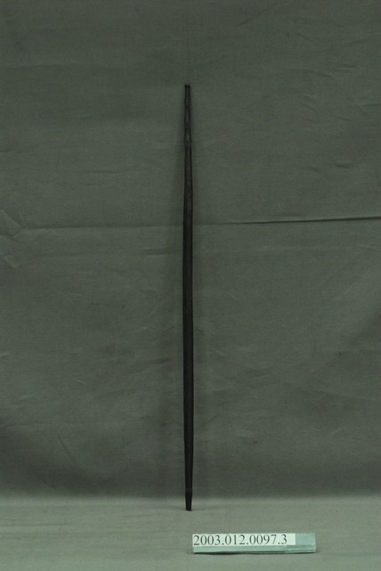 1. 本件為織布機組件之一綜絖棒,達悟語稱koyoen,外形為十分細長之木棒,兩端削成尖狀,一端雕刻成3節式樣,另一端為一節突起。織布時依照所需要織出的紋樣,使用1-5支綜絖棒,其功能在穿綜絖便於分闢梭口,將綜絖棒的一支穿進綜套內,另一支位於套外,再以線將開口的一端紮牢,不使經線脫落或弄亂,以織出各種變化之圖紋。