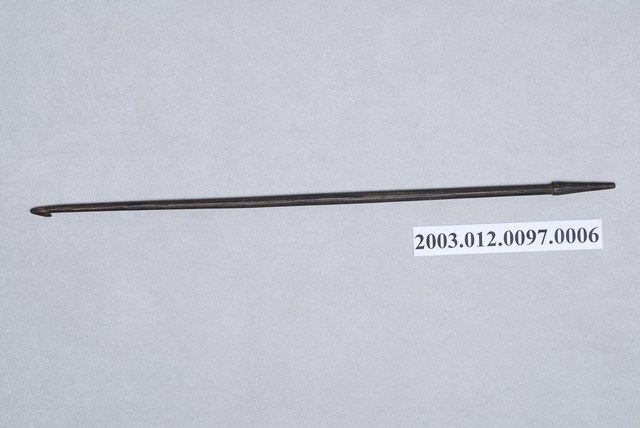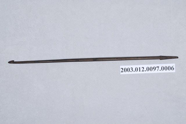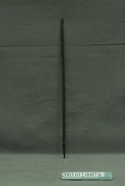 1. 本件為織布機組件之一綜絖棒,達悟語稱koyoen,外形為十分細長之木棒,兩端削成尖狀並雕刻成1節式樣。織布時依照所需要織出的紋樣,使用1-5支綜絖棒,其功能在穿綜絖便於分闢梭口,將綜絖棒的一支穿進綜套內,另一支位於套外,再以線將開口的一端紮牢,不使經線脫落或弄亂,以織出各種變化之圖紋。