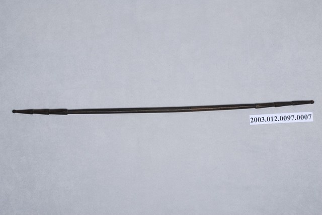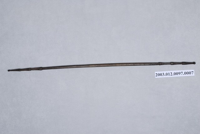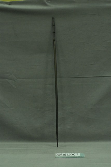 1. 本件為織布機組件之一綜絖棒,達悟語稱koyoen,外形為十分細長之木棒,兩端削成尖狀並雕刻成3節式樣。織布時依照所需要織出的紋樣,使用1-5支綜絖棒,其功能在穿綜絖便於分闢梭口,將綜絖棒的一支穿進綜套內,另一支位於套外,再以線將開口的一端紮牢,不使經線脫落或弄亂,以織出各種變化之圖紋。