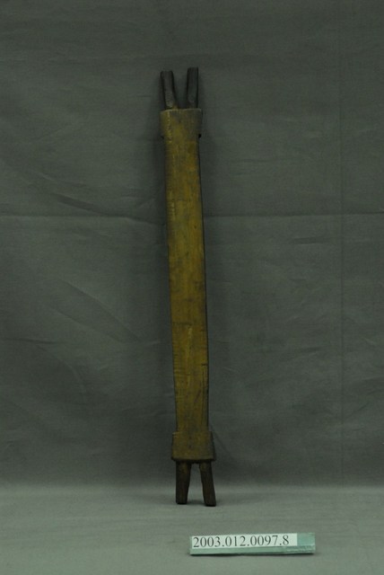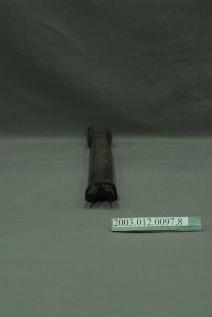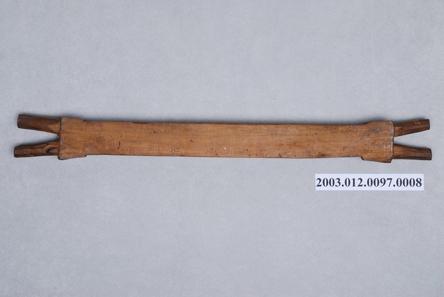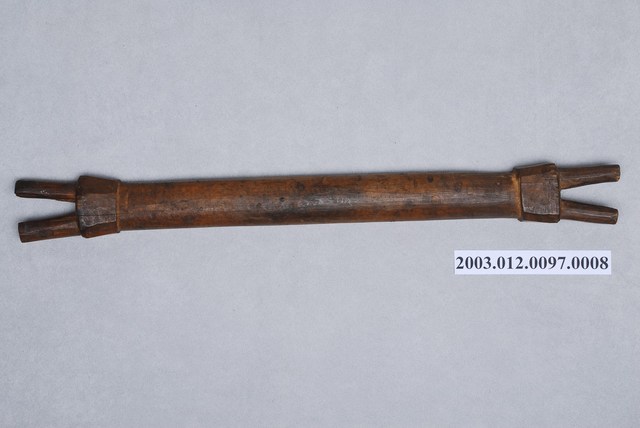 1. 織布工具之一布卷,又稱布夾,達悟語稱acip,褐色長條形短木棒,左右兩端削成凹槽,各帶兩個錐狀突起,器身縱剖面呈半圓形,與織布機另一同型制之布卷(2003.012.0097.0010)合併使用作為捲布夾。布卷是用來固定近身這端的經線,使用方法是把經線夾在布卷的兩隻木棒中間,再將背帶兩端的麻繩自身後引至腰際,繞過布卷上的缺口固定好布卷。布卷的功能在夾緊經線或已織好的布匹,使布面與經線呈張緊的狀態。