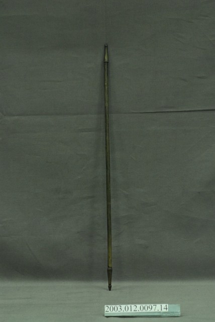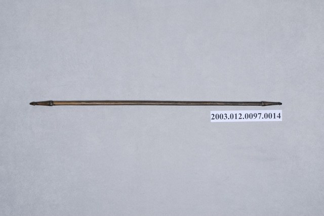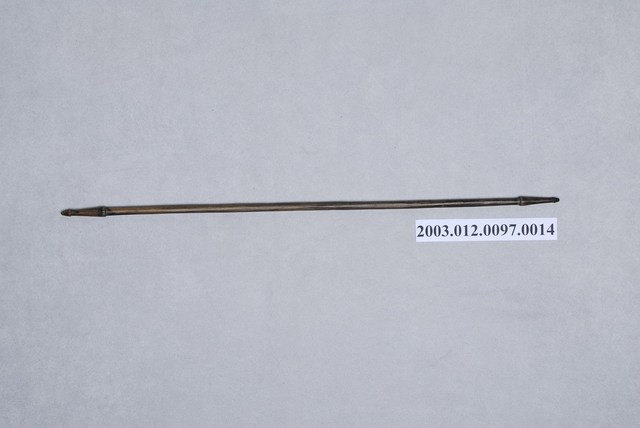 1. 本件為織布機組件之一綜絖棒,達悟語稱koyoen,外形為十分細長之木棒,兩端削成尖狀並雕刻成1節式樣。織布時依照所需要織出的紋樣,使用1-5支綜絖棒,其功能在穿綜絖便於分闢梭口,將綜絖棒的一支穿進綜套內,另一支位於套外,再以線將開口的一端紮牢,不使經線脫落或弄亂,以織出各種變化之圖紋。