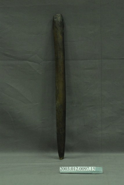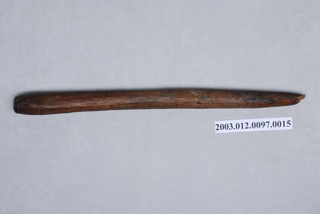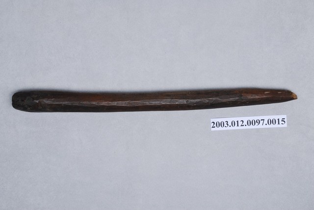 1. 本件為織布工具之一的開口輔助棒,外型一端較粗,另一端削成尖狀黑褐色木棒,主要用來輔助綜絖棒將經線撐開之用。