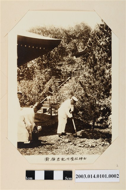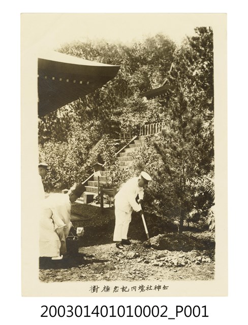 1.本物件為宜蘭神社境內紀念植樹,照片下方寫有「仝神社境內紀念植樹」,應同為宜蘭神社。照片中有數名白衣男子正手持鋤頭水桶等工具植樹,照片後方與角落可見木製神社建築,周遭草木繁盛。2.日本在二次世界大戰前已擁有多處海外殖民地,為了達成日本在太平洋亞洲地區的軍事、經濟、政治的統治,日本便在海外殖民地區建立許多神社,以「八紘一宇」為精神目標,意為日本統一世界為一家。因此在戰爭體制下,殖民地或占領地建立的神社,便肩負了推廣軍國主義政策與傳播神皇思想的重要責任與工具。3.宜蘭神社,落成於明治38年(1905),位於宜蘭縣員山鄉,現為宜蘭忠烈祠。