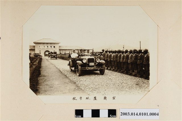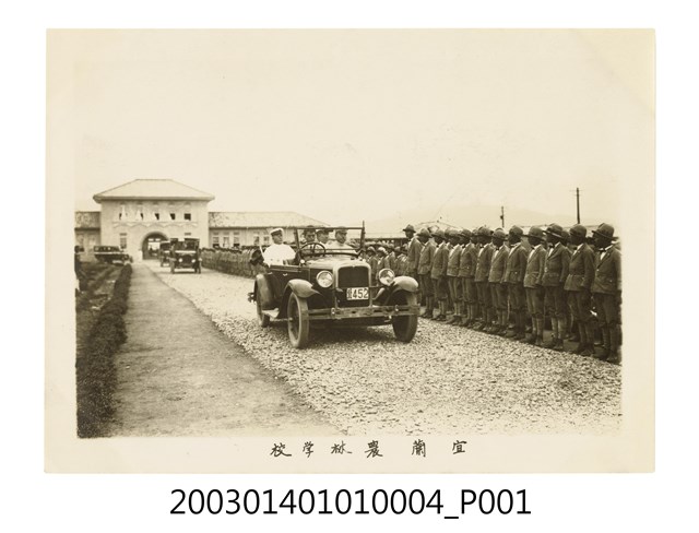 1.本物件為宜蘭農林學校,照片中央碎石地車道上行進有數臺車輛,最前方車輛上乘坐有一名司機與三名白衣男子,應為學校高層或政府官員,右側著制服者應為學生。2.宜蘭農林學校成立於昭和元年(1926),全名為「臺北州立宜蘭農林學校」,光復後更名為「臺灣省立宜蘭農業職業學校」,現為國立宜蘭大學。