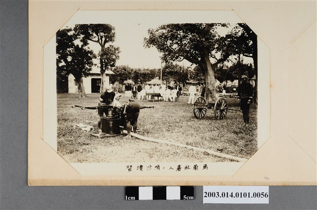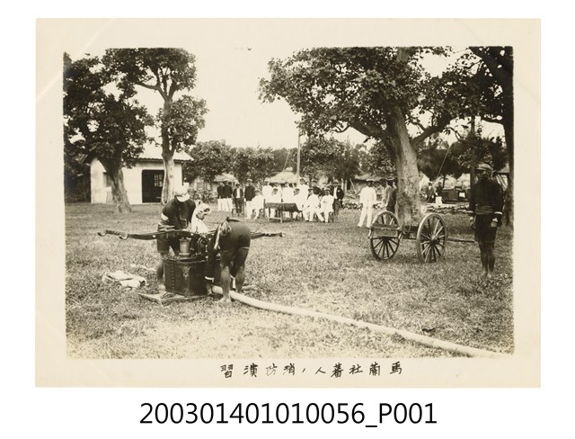 1.本物件為馬蘭社原住民消防演習其一,照片下方寫有「馬蘭社蕃人消防演習」,照片中可見兩赤腳男子,正在一處空曠草地上操作一舊式消防栓,有諸多官員坐於後方觀看。2.馬蘭社屬阿美族,主要活動區域位於現今臺東縣臺東市中心里。曾受到卑南族統治,直到該社的傳奇英雄「馬罕漢」出現繼任頭目後帶領馬蘭社反擊,並與附近各族交往,使馬蘭重獲自主與強大。