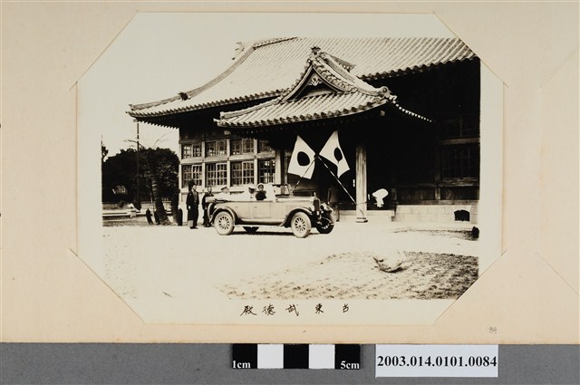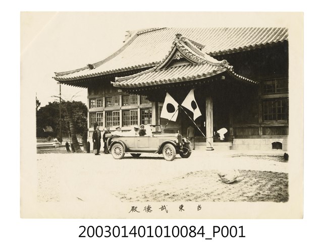 1.本物件為臺東武德殿,照片下方寫有「臺東武德殿」,照片中可見武德殿前有兩面太陽旗交叉矗立,汽車停於殿門口,殿前廣場空曠,並無太多旁人。2.武德殿是日本人為提倡武士精神所蓋的武館,目的是為了涵養武德、發揚大和魂、培養忠君愛國精神。作為殖民地的臺灣,早期武德殿作為警察的訓練重地,至同化政策時期推廣至學校,廣設武道場用以訓練學生柔道、劍道、弓道等項目,至太平洋戰爭時期,為將殖民地區人民納入動員體系,建築本身更兼具了集會場所、精神講話與作戰準備的功能。3.臺東武德殿,落成於昭和3年(1928),位於臺東市區大同路上,現已拆除,改建為國立臺東生活美學館。