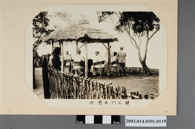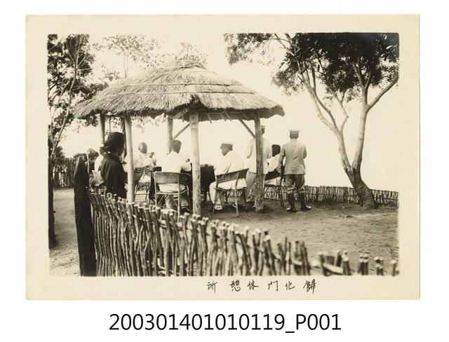 1.本物件為歸化門休息站,照片下方寫有「歸化門休憩所」,照片中可見多名官員坐在一涼亭中,涼亭位於一竹籬圍起的小空間裡,涼亭旁種有幾棵樹木。2.力里社(リキリキ社)位於今日屏東縣春日鄉北部,屬排灣族,由勒克勒克、鋼脆社合併而成,西元1914年南蕃事件後,排灣族諸社包含力里社在內,族人遭強制遷移以削減部落人數,以防再次動亂,諸社遷出人口即為歸化門社,歷經遷徙後為現今歸崇部落。