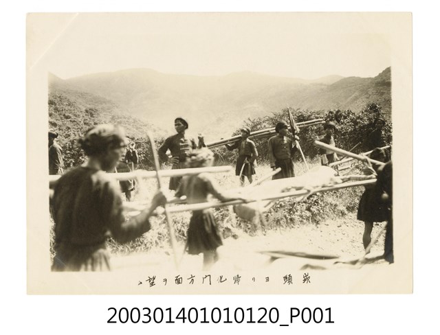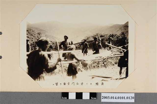 1.本物件為從崁頭遠望歸化門方向,照片下方寫有「崁頭ヨリ歸化門方面タ望ル」,照片中可見前方應為數名男子扛著轎子,後方有數名男子手持竹竿,但不知用意為何。2.力里社(リキリキ社)位於今日屏東縣春日鄉北部,屬排灣族,由勒克勒克、鋼脆社合併而成,西元1914年南蕃事件後,排灣族諸社包含力里社在內,族人遭強制遷移以削減部落人數,以防再次動亂,諸社遷出人口即為歸化門社,歷經遷徙後為現今歸崇部落。