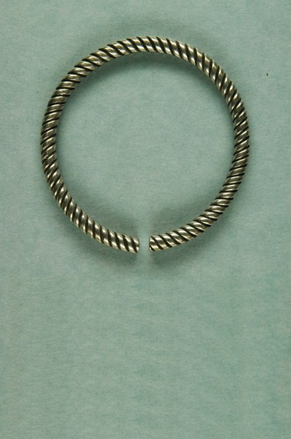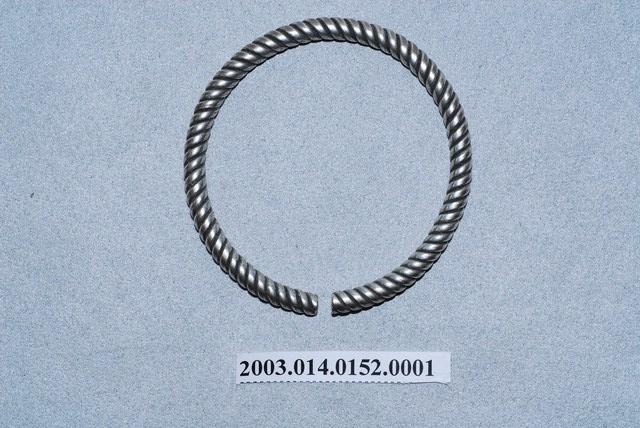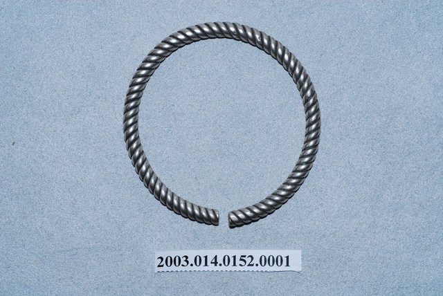 此繩紋銀手鐲造型簡單樸實,素面無紋飾。全器由數條銀條交錯纏繞成環,開口處可供手腕穿戴。繩紋與人類的關係最早可追溯自史前時代,那時便有人類結繩記事,或將繩索壓印於陶器做為表面裝飾紋樣。由於繩索具有綿延不絕且可成結的特性,繩紋便有著子孫綿延不斷且團結的吉祥寓意,在歷代紋飾中皆可發現繩紋的存在。繩紋造型的手鐲便是中國南方常見的手鐲樣式,在臺灣民間俗稱「繩索環」、「索仔環」或「腳車藤」。