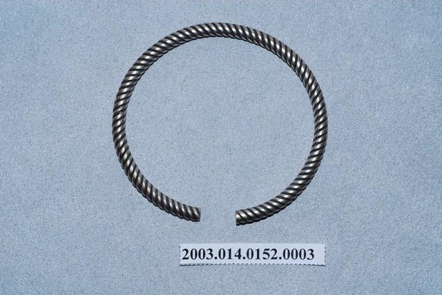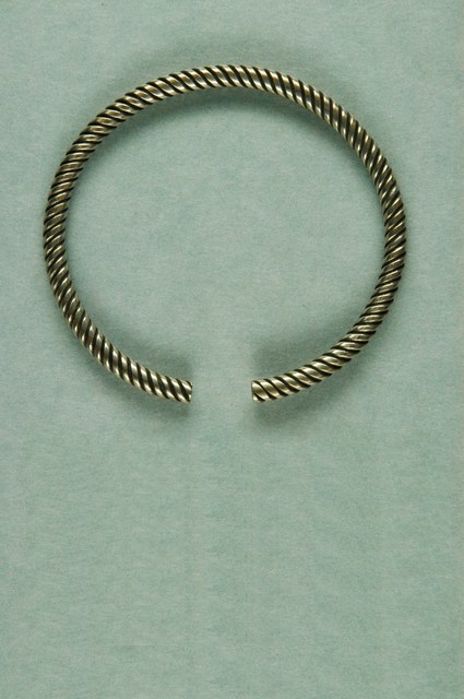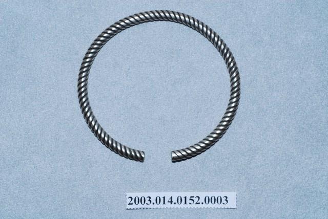 此繩紋銀手鐲造型簡單樸實,素面無紋飾。全器由數條細銀條交錯纏繞成環,外表整齊平滑排列細密,開口處可供手腕穿戴。繩紋與人類的關係最早可追溯自史前時代,那時便有人類結繩記事,或將繩索壓印於陶器做為表面裝飾紋樣。由於繩索具有綿延不絕且可成結的特性,繩紋便有著子孫綿延不斷且團結的吉祥寓意,在歷代紋飾中皆可發現繩紋的存在。繩紋造型的手鐲便是中國南方常見的手鐲樣式,在臺灣民間俗稱「繩索環」、「索仔環」或「腳車藤」。