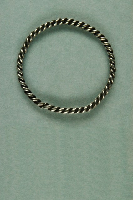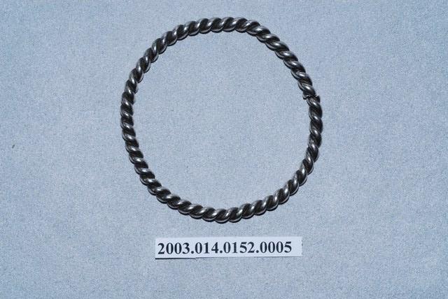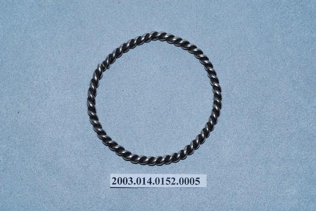 此繩紋銀手鐲造型簡單樸實,素面無紋飾。全器由數條銀條交錯纏繞成環,器身排列鬆散具有明顯空隙,首尾端相觸略有變形不對稱,開口處可供手腕穿戴。繩紋與人類的關係最早可追溯自史前時代,那時便有人類結繩記事,或將繩索壓印於陶器做為表面裝飾紋樣。由於繩索具有綿延不絕且可成結的特性,繩紋便有著子孫綿延不斷且團結的吉祥寓意,在歷代紋飾中皆可發現繩紋的存在。繩紋造型的手鐲便是中國南方常見的手鐲樣式,在臺灣民間俗稱「繩索環」、「索仔環」或「腳車藤」。