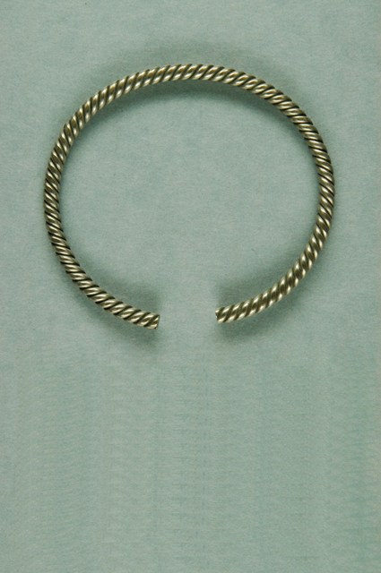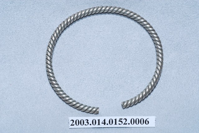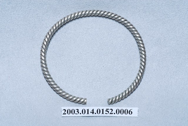 此繩紋銀手鐲造型簡單樸實,素面無紋飾。全器由數條銀條交錯纏繞成環,外表整齊平滑排列細密,開口處可供手腕穿戴。繩紋與人類的關係最早可追溯自史前時代,那時便有人類結繩記事,或將繩索壓印於陶器做為表面裝飾紋樣。由於繩索具有綿延不絕且可成結的特性,繩紋便有著子孫綿延不斷且團結的吉祥寓意,在歷代紋飾中皆可發現繩紋的存在。繩紋造型的手鐲便是中國南方常見的手鐲樣式,在臺灣民間俗稱「繩索環」、「索仔環」或「腳車藤」。