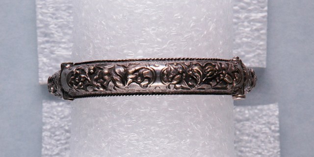 本文物為花卉雕飾金屬手鐲,整體顏色偏銀色,上有花卉雕飾。臺灣原住民及漢人皆會帶配飾,而就漢人而言女性使用飾品的比率比男性高。傳統社會中女性配戴的首飾,代表家族的財富及地位,尤其在嫁娶之時,以金銀飾品作為聘禮也十分常見。在臺灣貧者在嫁娶至少要有銀簪,而富者並無限制。因此,飾品不但反映當時社會的審美觀,也是女性及其背後家族之社會地位之象徵。