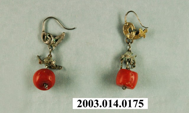 本文物為珊瑚耳飾1對,最上方皆有一耳勾,下方又墜有花卉等小金屬綴飾,最下方為紅色珊瑚珠。臺灣原住民及漢人皆會帶配飾,而就漢人而言女性使用飾品的比率比男性高。傳統社會中女性配戴的首飾,代表家族的財富及地位,尤其在嫁娶之時,以金銀飾品作為聘禮也十分常見。在臺灣貧者在嫁娶至少要有銀簪,而富者並無限制。因此,飾品不但反映當時社會的審美觀,也是女性及其背後家族之社會地位之象徵。