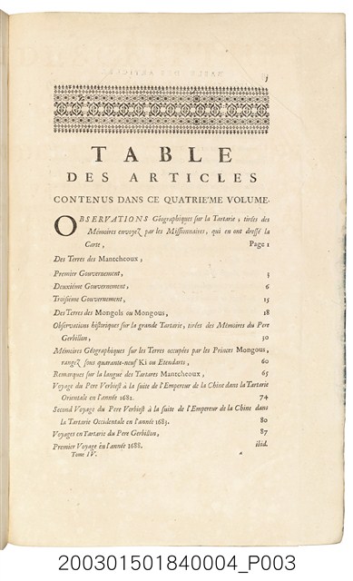本書是由法國耶穌會士杜赫德(Jean Baptiste du Halde)所編著。全書共四大卷,受入了多名傳教士(其中法人23名)所寫或所譯有關中國的報告、信札等,是當時歐洲研究中國各方面的百科全書式巨著。當時法國啟蒙學者Voltaire讚揚此書是全世界最宏偉與最優秀描述中國的書。這套書的產生也是當時歐洲 “中國熱”下之產物。本物件為第四冊,其內容涵蓋有關於韃靼的地理敘述、各個傳教士書寫的信函及所繪的地圖等等。