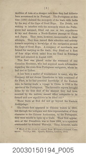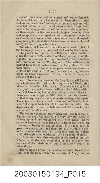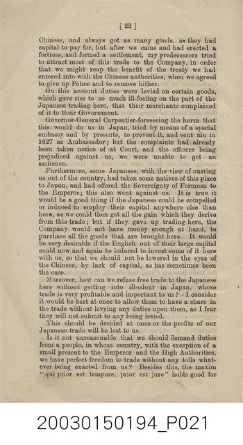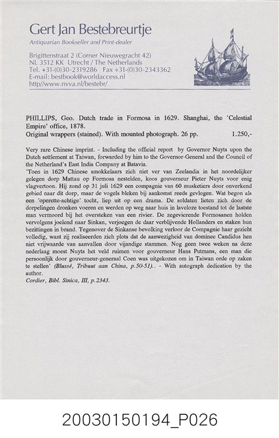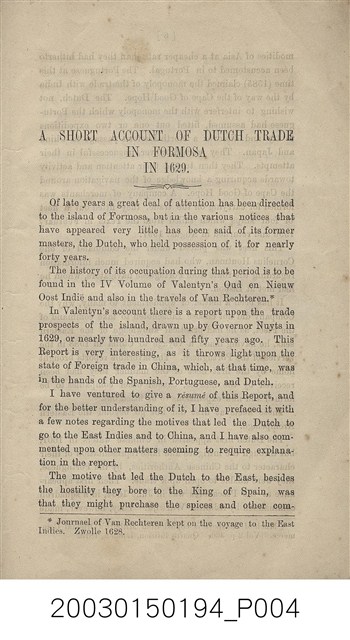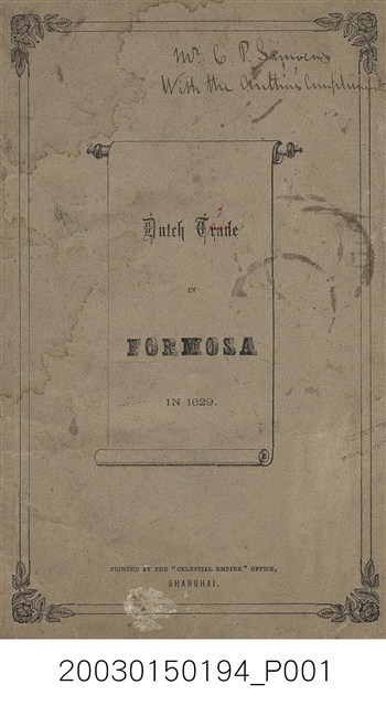 本書作者為英國人喬治菲利普(George Phillips),1857年來中國任英國領事館員,歷任許多職位後,於1892年退休返國。此書描述荷蘭東印度公司來到東方尋求貿易據點,最後佔領福爾摩沙之經過。書中也引用Valentijn、Van Rechteren、Balthasar Bort等人的資料。 扉頁文字: DUTCH TRADE IN FORMOSA IN 1629. PRINTED AT THE “CELESTIAL EMPIRE” OFFICE, SHANGHAI.。