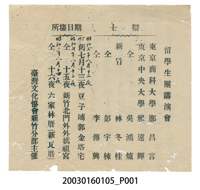 臺灣文化協會新竹分部於1927年8月12-14日主辦的「留學生團講演會」宣傳單。