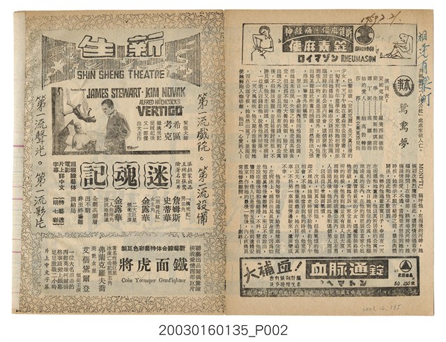 臺北新生戲院1959年提供觀眾的電影本事,雙面印刷。一面右半部是漢姆寇特(Helmut Käutner)導演的西德電影《鴛鴦夢》(Monpti, 1957)本事,上下搭配藥品廣告,空白處另有原子筆手寫數字「1959.2.21」,側邊則加註反共文字「共匪推行人民公社,處處家破人亡!」左半部是標題「新生戲院」(Shin Sheng Theatre),以及下期放映2部電影劇照及廣告,包括希區考克(Alfred Hitchcock)導演的《迷魂記》(Vertigo, 1958)與R.G. Springsteen導演的《鐵面虎將》(Cole Younger Gunfighter, 1958)。