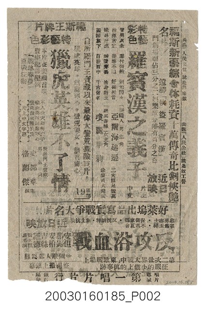 一面是約翰休斯頓(John Huston)導演、約翰韋恩(John Wayne)與安藤英子主演的美國電影《蠻夷與藝妓》(The Barbarian and the Geisha, 1958)的本事,結尾處有「新竹縣警察局驗訖新警說檢字第八六六號」等字樣;同面下方是近期上映電影Douglas Sirk執導的《碧海青天夜夜心》(The Tarnished Angels, 1957)的廣告,底下邊緣空白處標註「佳片總匯,樂民大戲院」字樣。