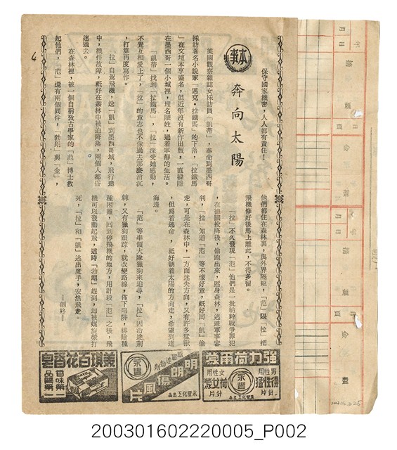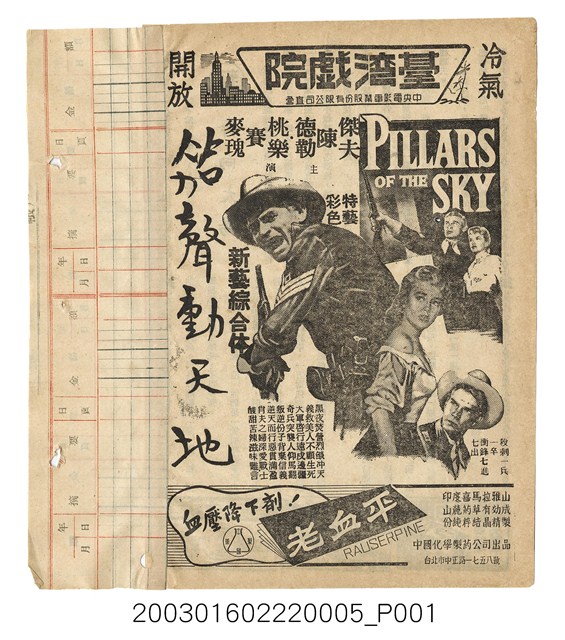 上有標題為「臺湾戲院」,以及「中央電影事業股份有限公司直營」、「冷氣開放」等字樣。其下為美國片《笳聲動天地》(Pillars of the Sky, 1956)的電影劇照及文案廣告,本片由喬治馬歇爾( George Marshall)執導,傑夫陳德勒 ( Jeff Chandler)、桃樂賽麥瑰(Dorothy Malone) 等主演的西部片,描述在邊疆保護區的部族首領及入侵白人軍隊所發生的爭戰故事。下方另有藥品廣告。