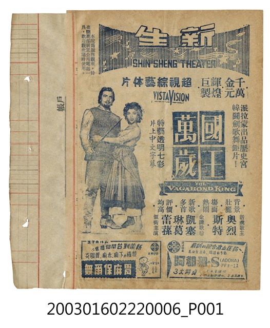本件為臺北新生戲院1950年代提供觀眾的電影本事,單色印刷。該面上標題為「新生戲院(SHIN SHENG THEATER)」,以及「糖菓部裝置公共電話」的廣告字樣,其下為美國片《國王萬歲》(The Vagabond King, 1956)的電影劇照及文案廣告,本片由派拉蒙電影公司出品,麥克卡堤斯(Michael Curtiz)執導,奧烈斯特(Oreste Kirkop)、凱塞琳葛蕾蓀(Kathryn Grayson) 等主演的歷史宮闈鬥劍歌舞片;下方另有藥品廣告。
