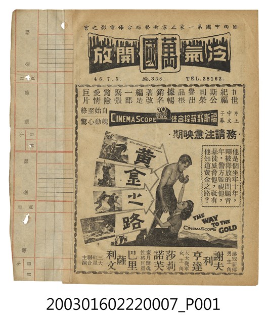 上印有標題「萬國戲院」、「自由中國第一家正宗新藝綜合体電影之宮」,以及日期「46.7.5」、期數「No. 338」、電話號碼「28162」等字樣。其下為美國片《黃金之路》的電影劇照及文案廣告,本片由廿世紀福斯電影公司出品,羅勃韋伯(Robert D. Webb)執導,謝夫利亨達(Jeffrey Hunter)、莎莉諾芙(Sheree North)、巴里薩利文(Barry Sullivan) 等主演的冒險劇情片;下方另有藥品廣告。