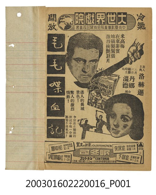 本件為臺北大世界戲院1950年代提供觀眾的電影本事,單色印刷。該面上標題為「大世界戯院」,以及「中央電影事業股份有限公司直營」、「冷氣開放」等字樣。其下為美國片《毛毛喋血記》(Something of Value, 1957)的電影劇照及文案廣告,本片由米高梅電影公司出品,李察布魯克(Richard Brooks)執導,知名演員洛赫遜(Rock Hudson)、丹娜溫德(Dana Wynter) 等主演的戰爭劇情片。下方另有武田製藥「可冬眠」藥品廣告。