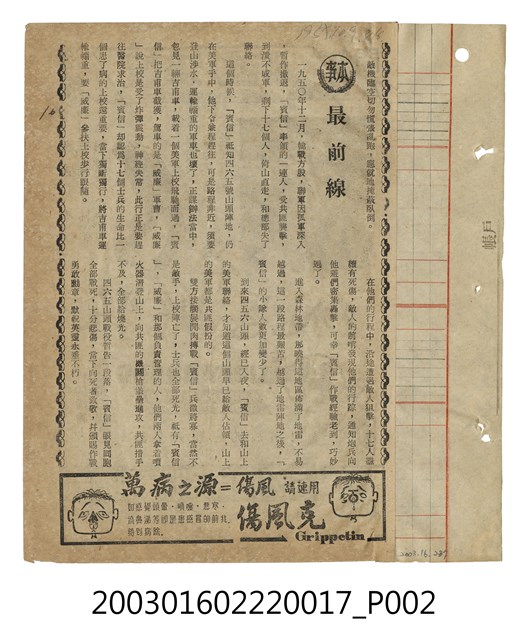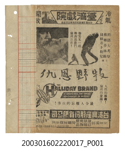 本件為臺北臺灣戲院1950年代提供觀眾的電影本事,單色印刷。該面上標題為「臺湾戱院」,以及「中央電影事業股份有限公司直營」、「冷氣開放」等字樣。其下為美國《牧野恩仇》(The Halliday Brand, 1957)的電影劇照及文案廣告,本片是由聯美電影公司出品,約瑟夫路易絲(Joseph H. Lewis)執導,約瑟夫考登(Joseph Cotten)、薇維莎林馥(Viveca Lindfors)、貝絲蒂卜勒兒(Betsy Blair)等主演的西部劇情片。下方另有房產貸款等廣告。