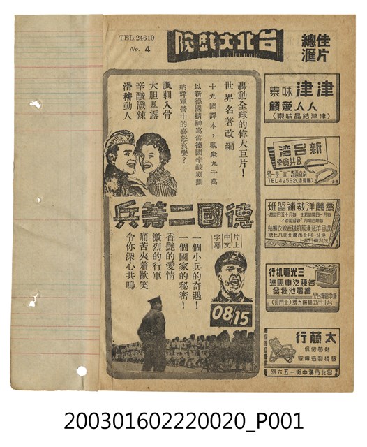 本件為臺北大戲院1950年代提供觀眾的電影本事,單色印刷。該面上標題為「台北大戱院」,以及期數「No. 4」、電話號碼「24610」等字樣。其下為西德片《德國二等兵》(08/15, 1954)的電影劇照及文案廣告,本片是由保羅美(Paul May)執導,福斯柏格(Joachim Fuchsberger)等主演的戰爭黑白片,描述1939年德國納粹軍營兩位小兵的奇遇故事。右側則分別有「津津味素」、「新台湾公共食堂」、「愛麗洋裁補習班」、「三光電机行」、「太藤行」等方格文字廣告。