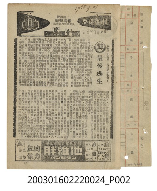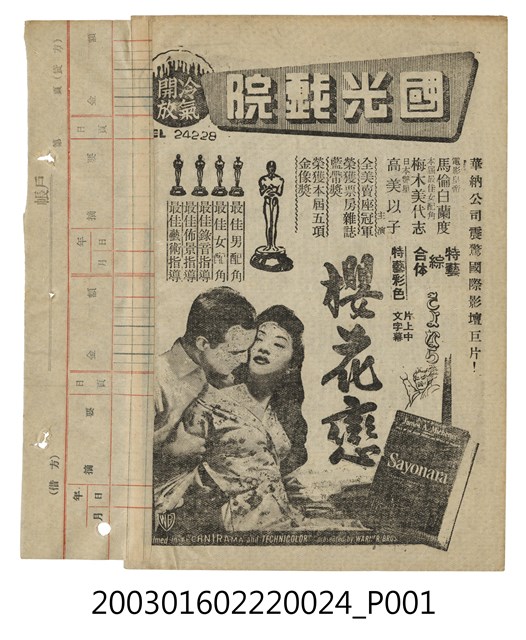 上印有「國光戱院」、「冷氣開放」、電話號碼「24228」等字樣。其下為美國片《櫻花戀》(Sayonara, 1957)的電影劇照及文案廣告,本片曾榮獲1958年5項奧斯卡獎項,由華納電影公司出品,約書亞羅根(Joshua Logan)執導,馬倫白蘭度(Marlon Brando)、梅木美代志(梅木三吉)、高美以子等主演的彩色愛情片,描述二次大戰期間美軍軍官與日本女子相戀卻遭受巨大阻礙的故事。