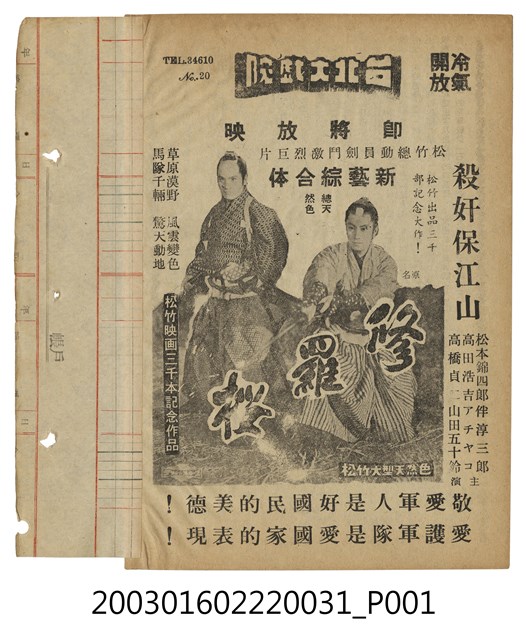 臺北大戲院發行《修羅櫻》電影本事,為該戲院本事第20期,出自「竜沙影集」電影本事剪貼簿。