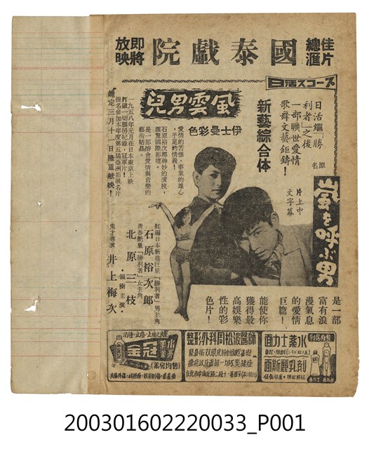 本件為臺北國泰戲院1950年代提供觀眾的電影本事,單色印刷。該面上標題為「國泰戱院」,以及「佳片總匯」、「即將放映」等字樣。其下為日本片《風雲男兒》(嵐を呼ぶ男, 1957)的電影劇照及文案廣告,強調本片「一九五八年元月在日本東京上映打破一切票房紀錄,冠軍片!」、「鐵定三月十一日隆重獻映」。由日活電影公司出品,井上梅次執導,石原裕次郎、北原三枝等主演的愛情歌舞電影。下方另有藥品、整型廣告。