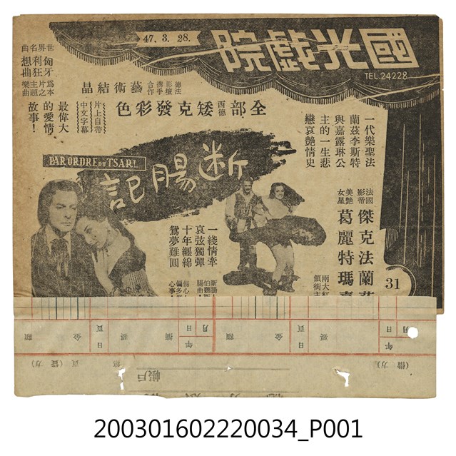 本件為國光戲院1950、1960年代提供觀眾的電影本事,僅有上半張,單色印刷。該面上標題為「國光戱院」、日期「47.3.28」、電話號碼「24228」等字樣。其下法語片《斷腸記》(Par ordre du tsar, 1954)的電影劇照及文案廣告,強調本片由「德法影壇攜手合作」,安卓霍加(André Haguet)執導,葛麗特瑪嘉(Colette Marchand)、 傑克法蘭茲(Jacques François)等主演的彩色愛情片,描述一代樂聖李斯特與嘉露琳公主的淒美悲戀故事。