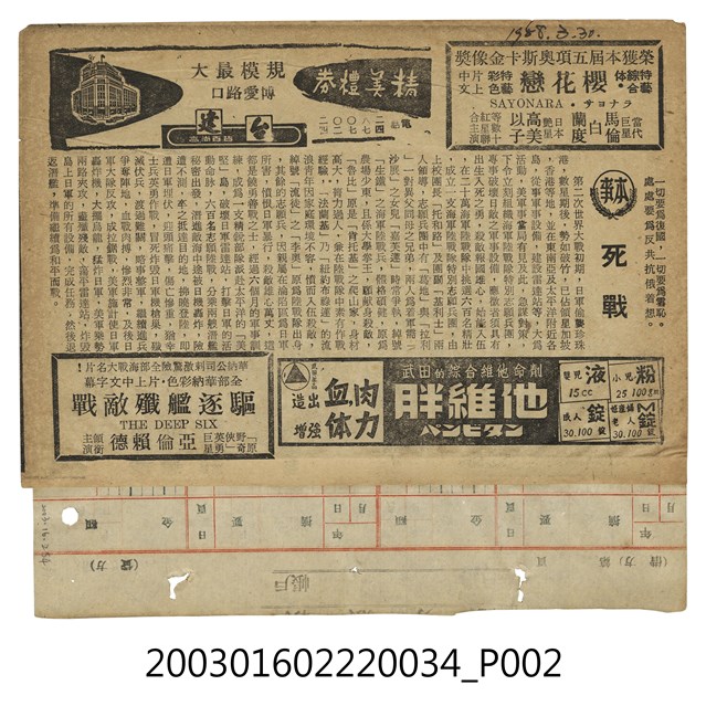 國光戲院發行《斷腸記》電影本事局部,於1958年3月28日發行,出自「竜沙影集」電影本事剪貼簿。