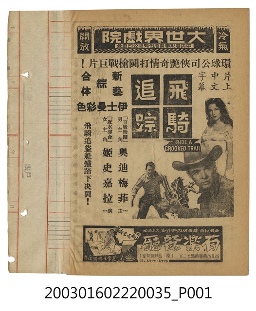 本件為臺北大世界戲院1950、1960年代提供觀眾的電影本事,單色印刷。該面上標題為「大世界戱院」,以及「中央電影事業股份有限公司直營」、「冷氣開放」等字樣。其下為美國片《飛騎追踪》(Ride a Crooked Trail, 1958)的電影劇照及文案廣告,本片由環球電影公司出品,傑西席伯斯(Jesse Hibbs)執導,奧迪梅菲(Audie Murphy)、姬史嘉拉(Gia Scala) 等主演的西部槍戰片。下方另有「有樂餐廳」廣告。