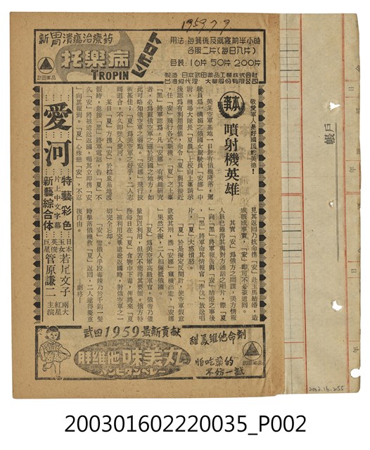大世界戲院發行《飛騎追踪》電影本事,出自「竜沙影集」電影本事剪貼簿。