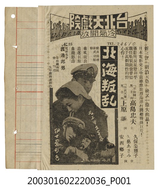 臺北大戲院發行《北海叛亂》電影本事,為該戲院本事第25期,出自「竜沙影集」電影本事剪貼簿。