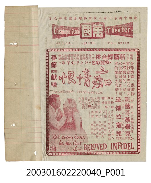 上印有「萬國」(Cosmopolitan Theater)、「自由中國第一家正宗新藝綜合體電影之宮」,以及日期「49.1.14」、期數「No. 490」、電話號碼「TEL32162」等字樣。其下為美國片《癡情恨》(Beloved Infidel, 1959)的電影劇照及文案廣告,本片由福斯電影公司發行,亨利金(Henry King)執導,葛蕾哥萊畢克(Gregory Peck)、黛柏拉寇兒(Deborah Kerr)等主演的愛情悲劇,描述知名小說家費茲傑羅糾纏在揮霍妻子與摰愛情人之間的悲劇愛情故事。