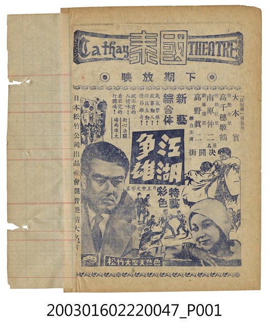 本件為臺北國泰戲院1950、1960年代提供觀眾的電影本事,單色印刷。該面上標題為「國泰」(Cathay THEATRE)等字樣;其下為日本片《江湖爭雄》(1958)的電影劇照及文案廣告,由松竹公司出品、堀内真直執導,大木實、高千穗姬鶴、南原仲二等主演的打鬥劇情片片。