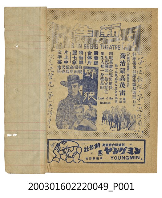本件為臺北新生戲院1950年代提供觀眾的電影本事,單色印刷。該面上標題為「新生(SHIN SHENG THEATER)」等字樣,其下為美國片《野狼》(Last of the Badmen, 1957)的電影劇照及文案廣告,本片由保羅蘭多(Paul Landres)執導,喬治蒙高茂雷(George Montgomery)、凱斯拉森(Keith Larsen)等主演的彩色西部片,描述一名芝加哥偵探前往西部找尋兇手的故事;下方另有藥品廣告。